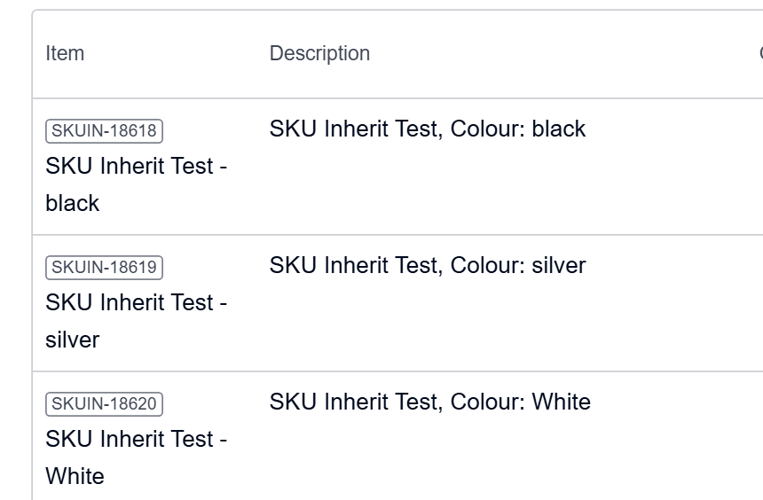 - If only the parent SKU code exists then it will be used and the chidren’s Product ID added as a suffix – see example below with the product in WC and their matching products in Xero.